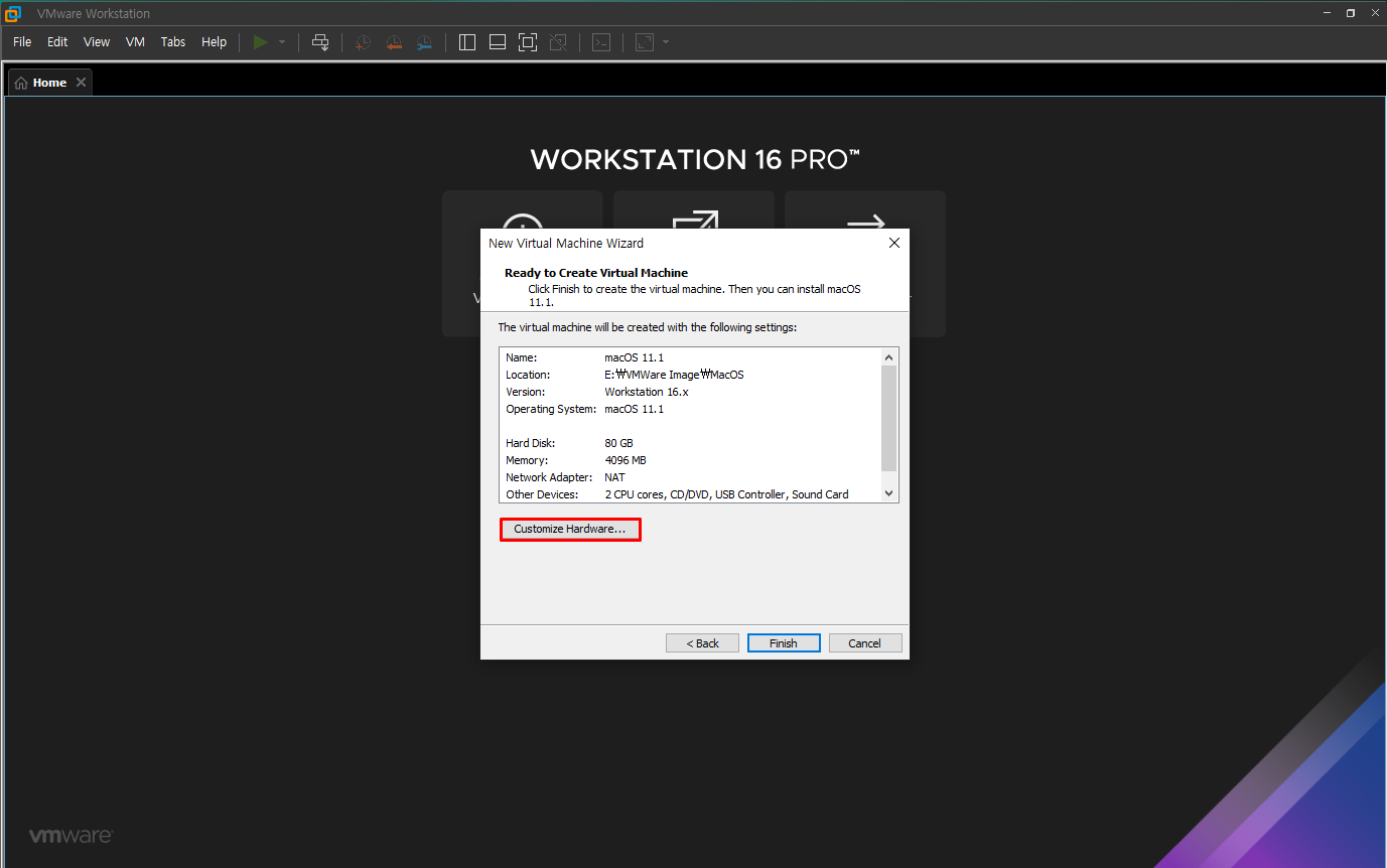 CPU 및 RAM 및 기타 설정을 변경하기 위해 Customize Hardware를 클릭합니다.