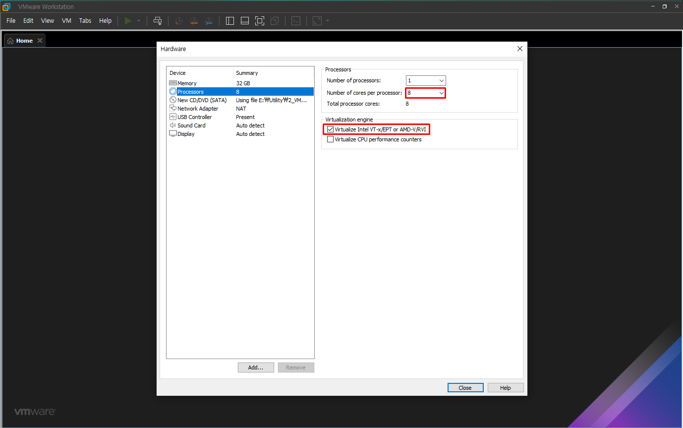 여기서 중요한 점은 Virtualize Intel VT-x/EPT or AMD-V/RVI를 체크박스 선택해야 합니다.