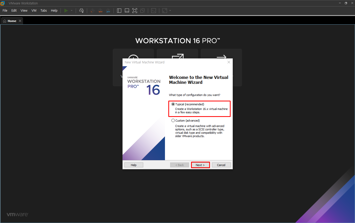 다음으로 VMWare를 실행하고 Create a New Virtual Machine을 클릭합니다.