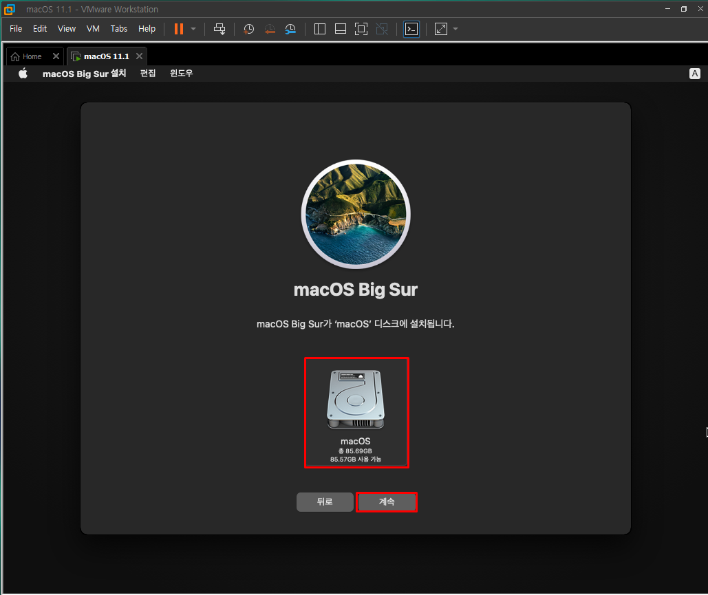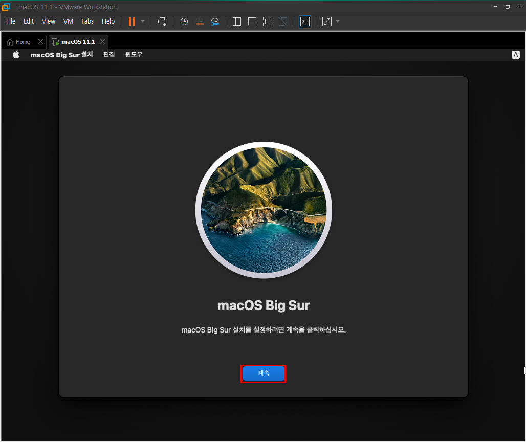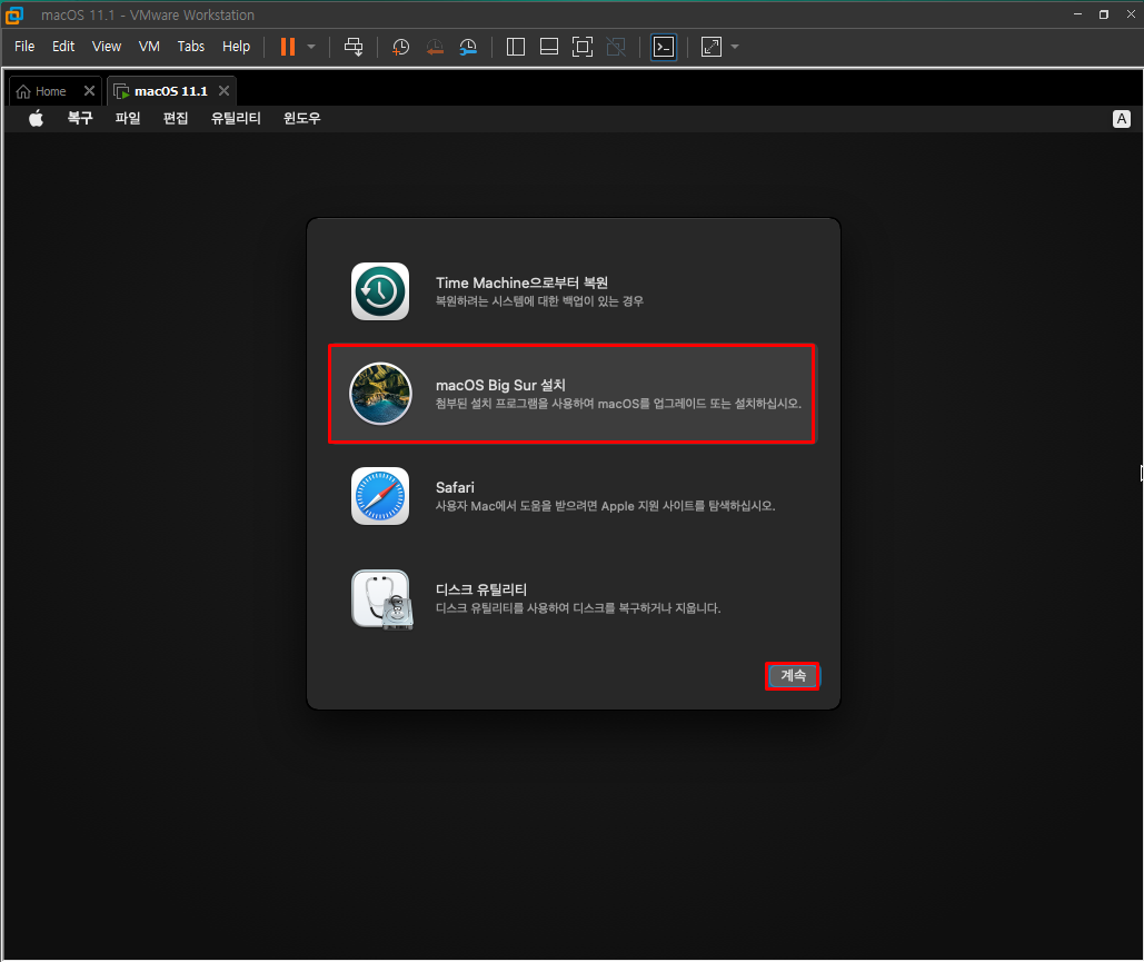 macOS Big Sur 설치를 선택 후 계속을 클릭합니다.