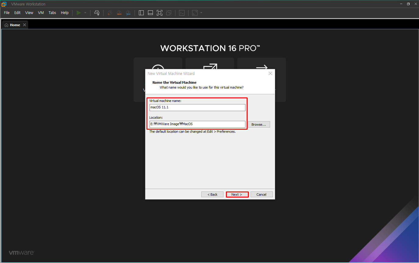 VM 이름과 저장위치를 지정하기 위해 Virtual machine name과 Location을 적절히 변경하고 Next를 클릭합니다.
