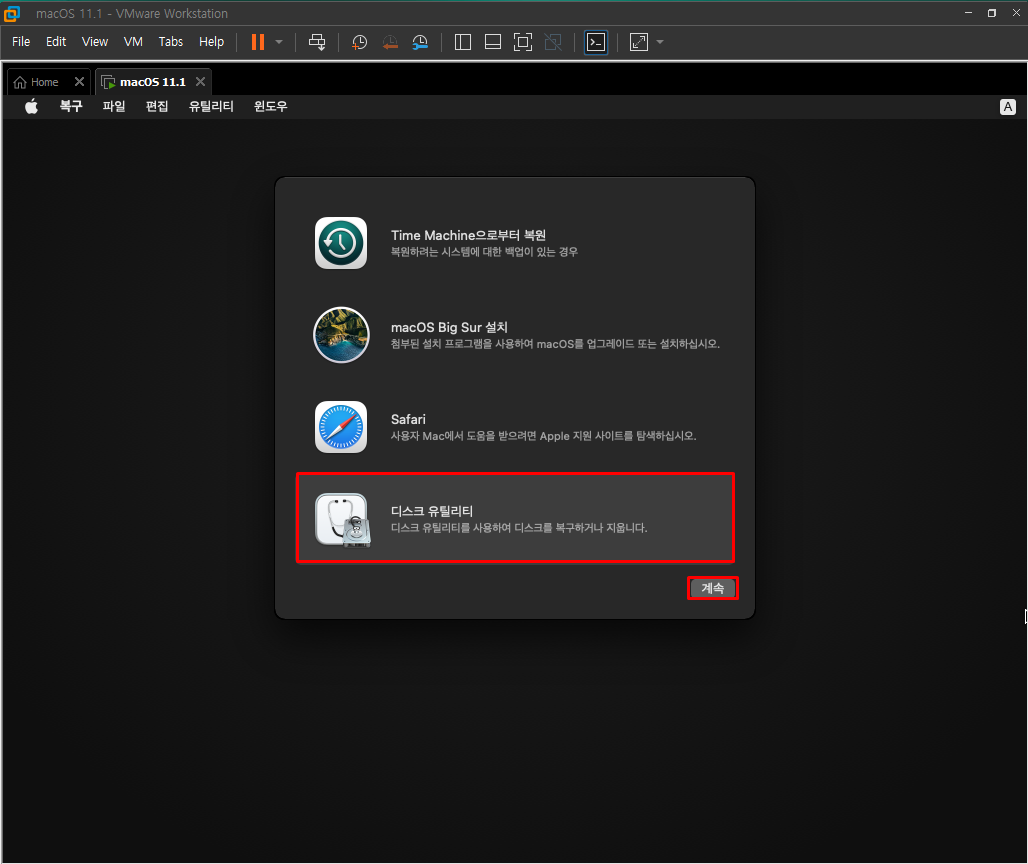디스크 포맷을 위해 디스크 유틸리티를 선택하고 계속을 클릭합니다.