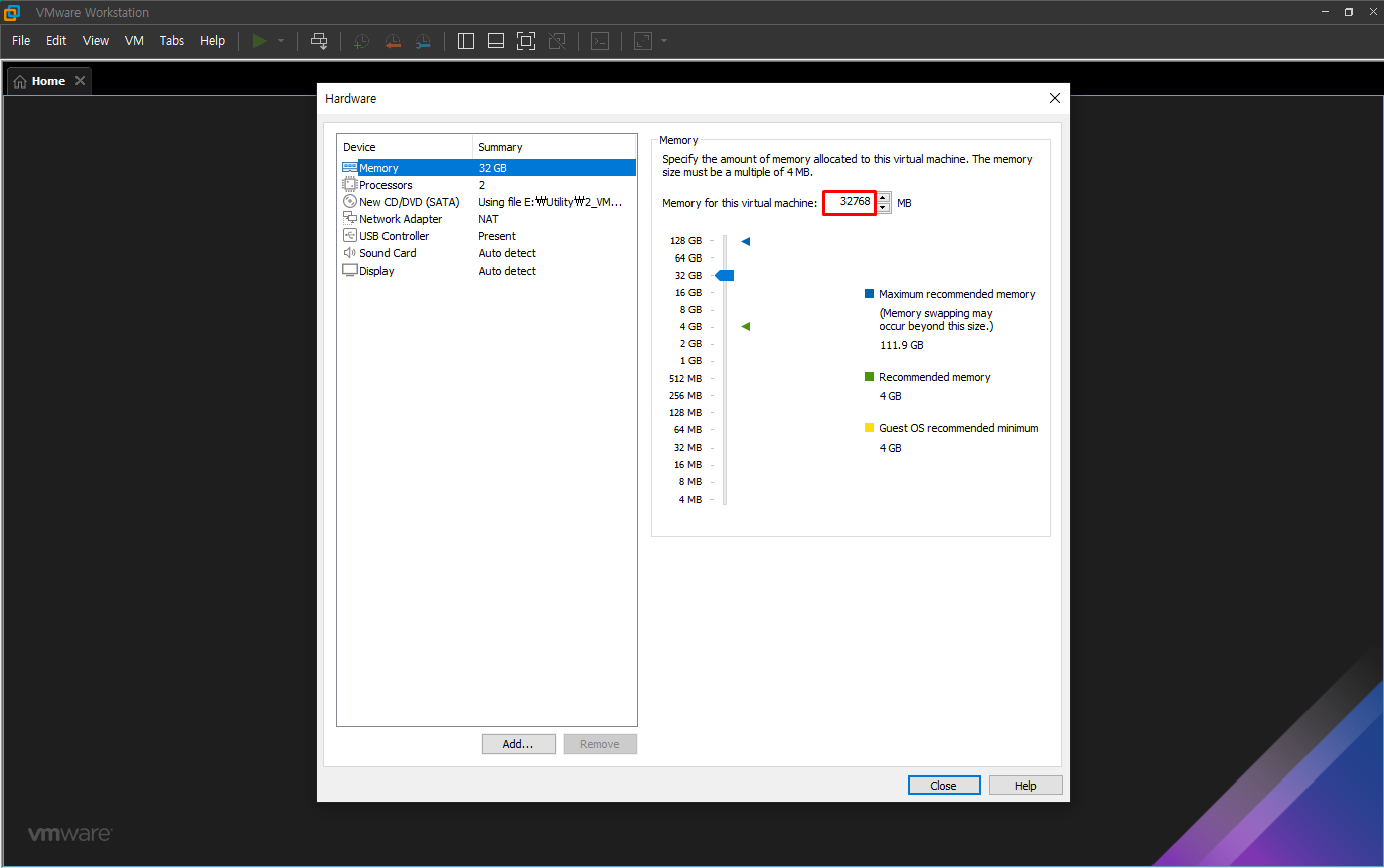 저는 128GB의 메모리를 사용할 수 있기 때문에 32GB로 설정하였습니다.