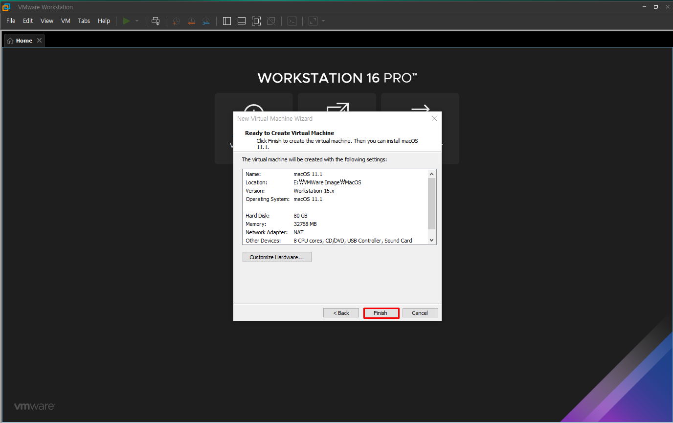 설정을 완전히 종료하기 위해 New Virtual Machine Wizard에서 Finish를 클릭합니다.