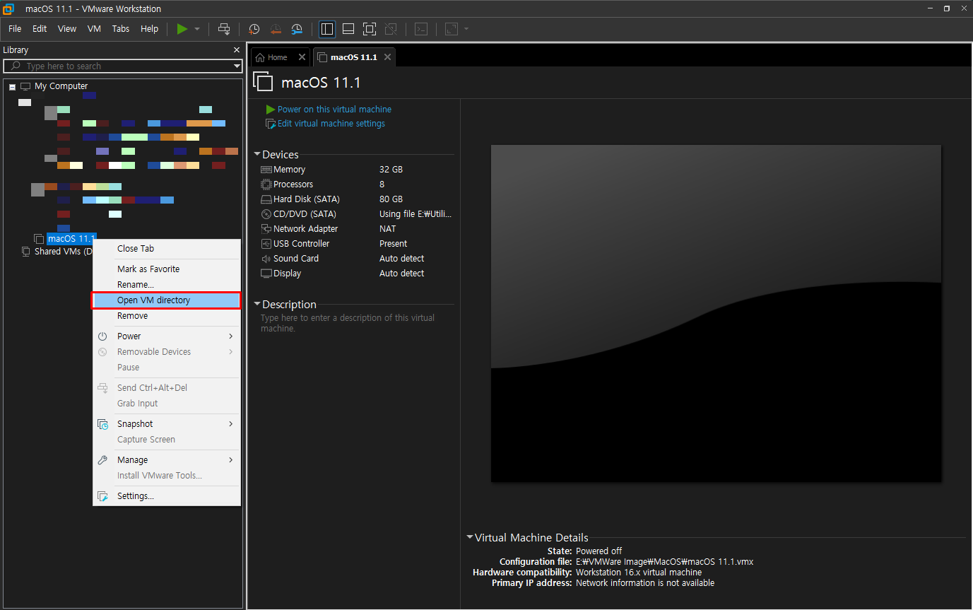 Library 창에서 ( 단축키 F9로 show / hide ) 방금 생성한 Virtual Machin을 우클릭하여 Open VM directory를 선택합니다.