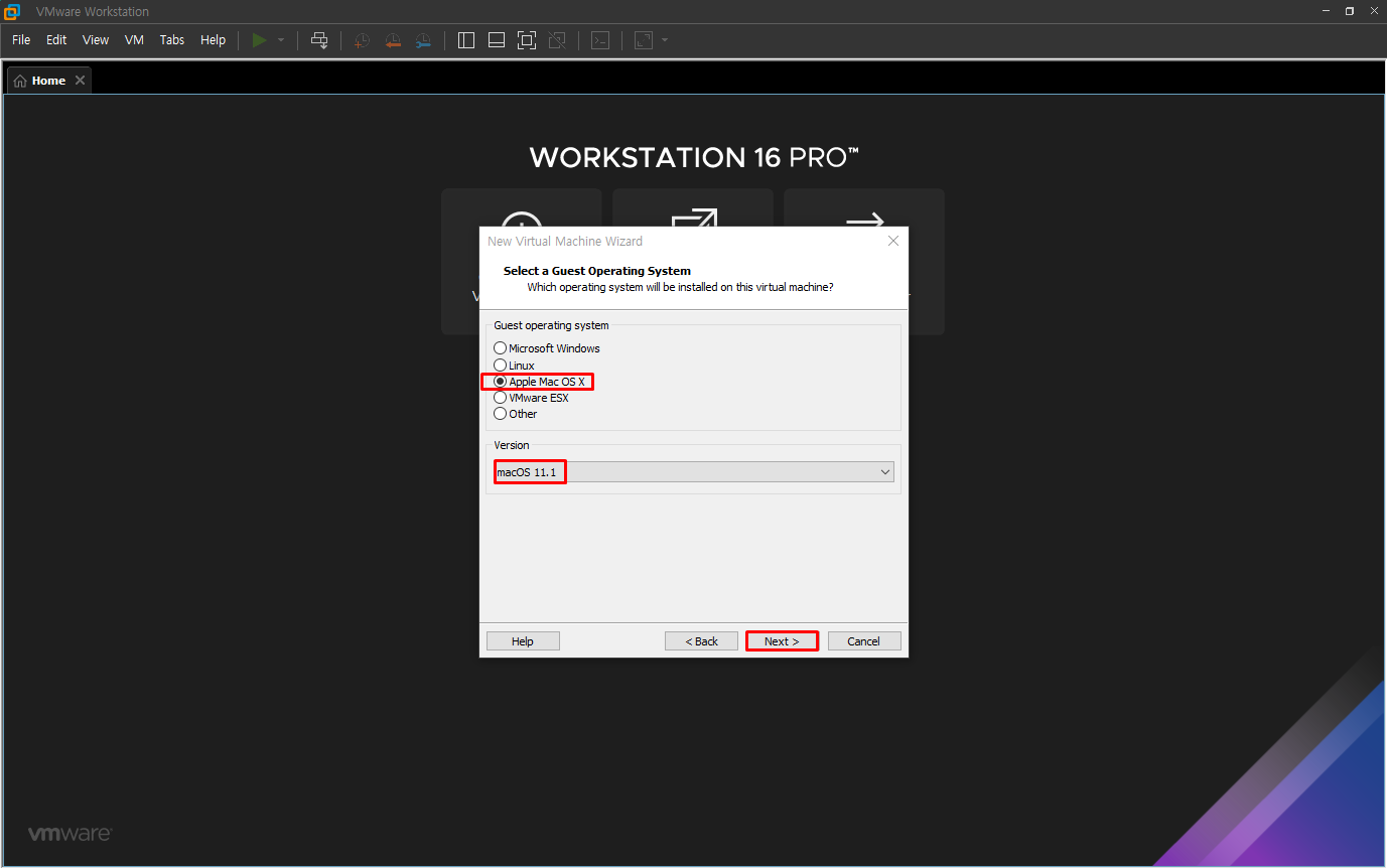 Apple Mac OS X 를 선택하고 macOS 11.1을 선택한 뒤, Next를 클릭합니다.