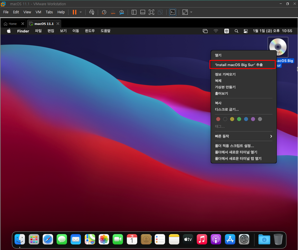 먼저 현재 CD-ROM에 삽입되어 바탕화면 우측상단에 표시된 Install MacOS Big Sur를 우클릭하여 추출을 클릭합니다.