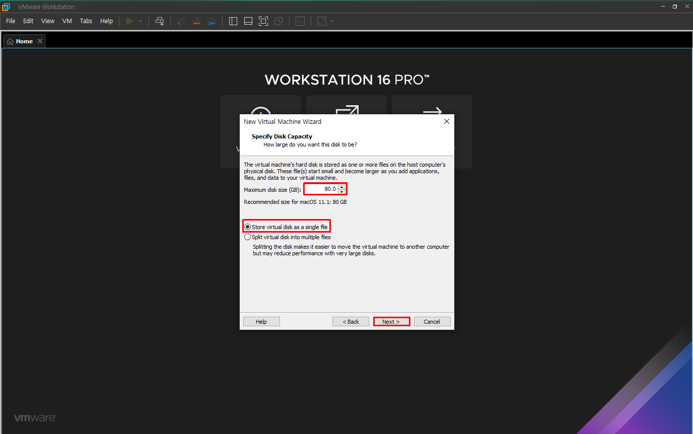 Maximum disk size는 80GB 또는 그 이상을 지정하고, Store virtual disk as a single file을 선택 후 Next를 클릭합니다.