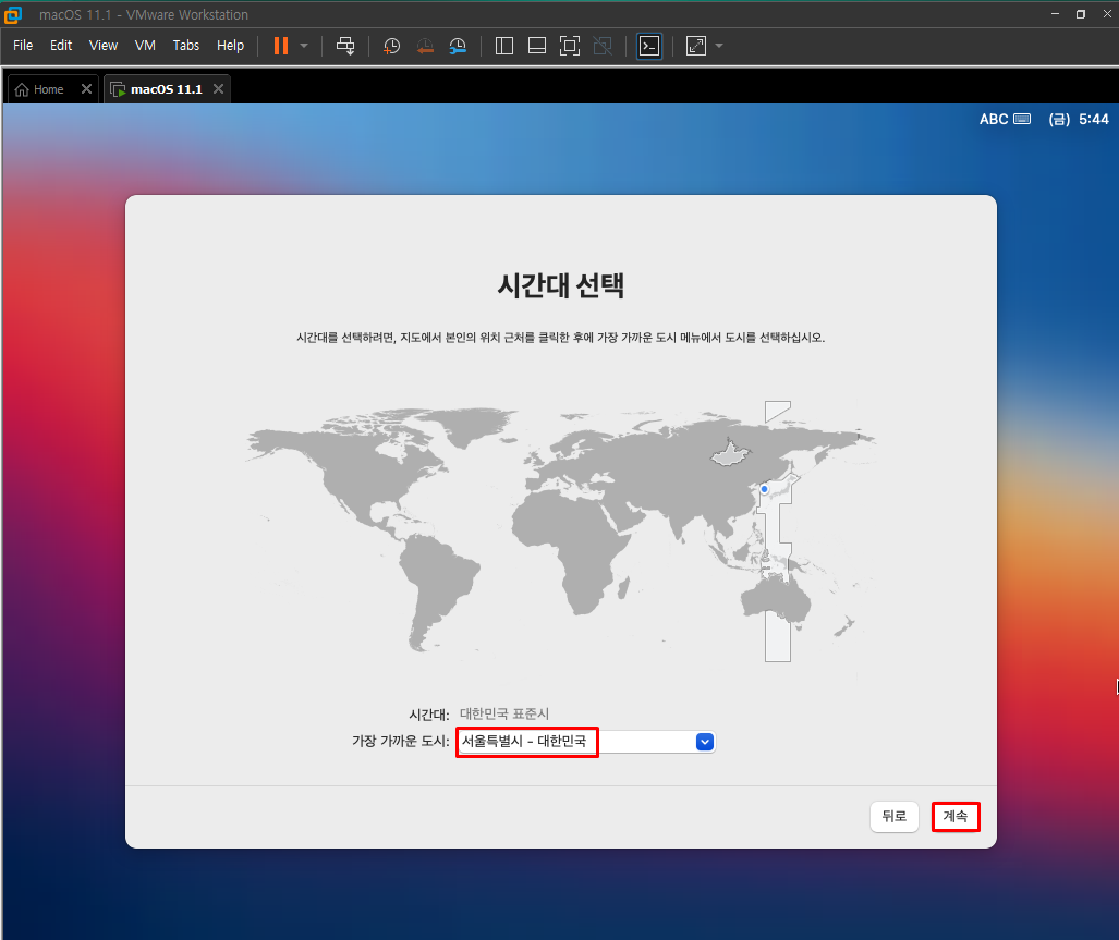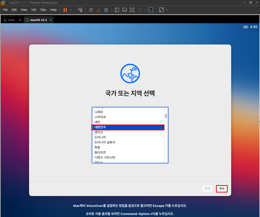 국가설정에서 대한민국을 선택 후 계속을 클릭합니다.