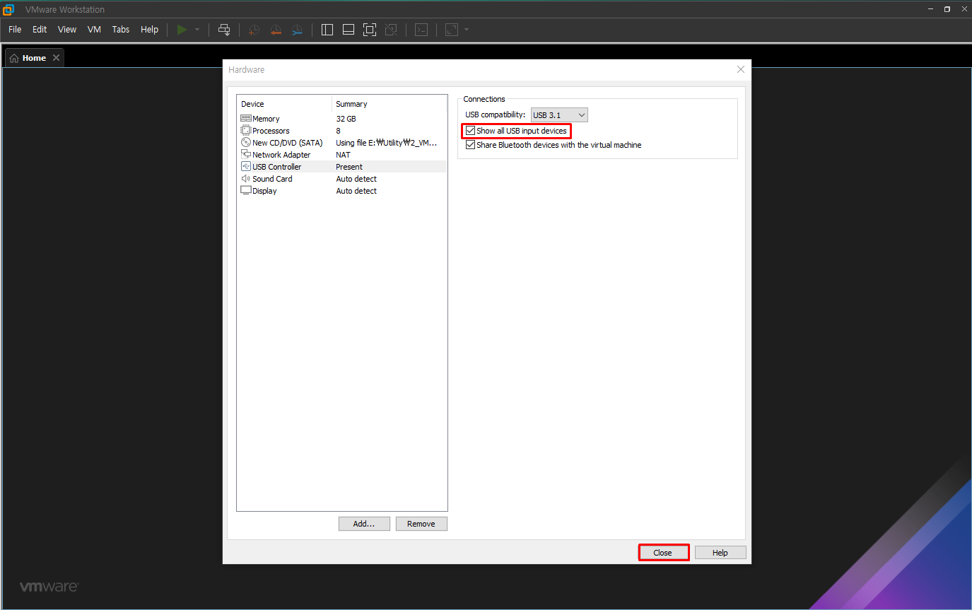 마지막으로 USB Controller에서 아래와 같이 Show all USB input devices를 체크박스 선택하고 Close를 클릭합니다.