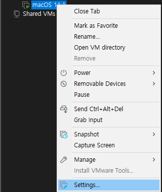 VMWare의 좌측 라이브러리에서 현재 Virtual Machine의 이름을 우클릭하여 Settings를 클릭합니다.