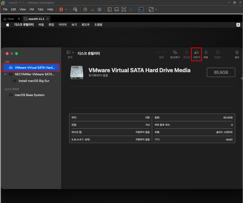 왼쪽 트리에서 제일 위에 있는 VMware Virtual SATA Hard... 를 선택하고 지우기를 클릭합니다.