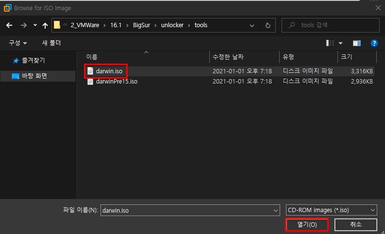 압축해제한 Bigsur.iso 파일을 선택하고 열기를 클릭합니다.